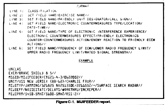 Use the meaconing, intrusion, jamming, and interference report feeder (MIJIFEEDER), Figure C-1, to report MIJI incidents to the appropriate C-E officer.
