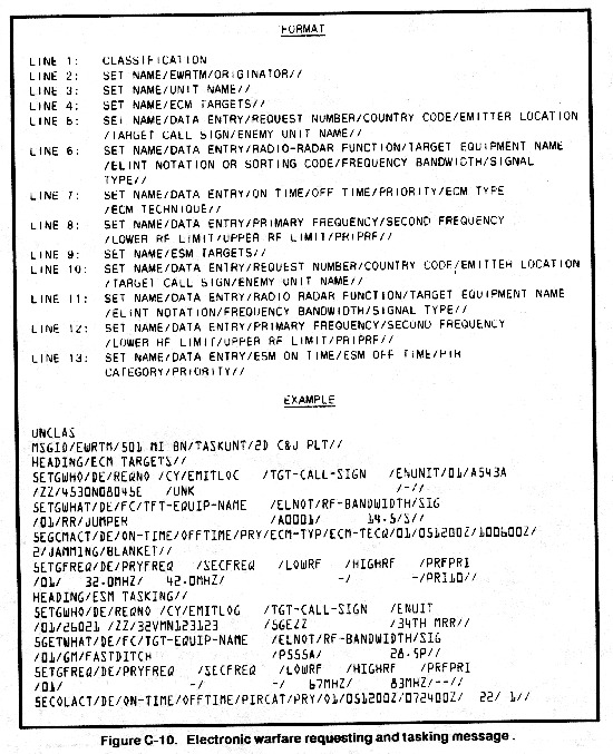 The electronic warfare requesting or tasking message (EWRTM), Figure C-10, is for tasking units to perform EW missions or to request EW support from nonorganic units. The EWRTM describes ECM and ESM targets. Use the electronic warfare employment message (EWEM) to answer EWRTMs that you receive. Do not use the EWRTM to task or request SIGINT assets. Use the electronic intelligence requirements tasking message (ERTM) and the communications intelligence advisory tasking (COMINTADTSK) to task or request SIGINT assets.