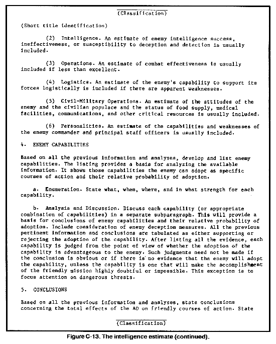 The intelligence estimate, Figure C-13, is a logical and orderly examination of the intelligence factors affecting mission accomplishment. It provides commanders with a basis for planning operations and for disseminating intelligence to their staffs and to other headquarters. It consists of five paragraphs which outline an analysis of the AO, enemy strength, and enemy capabilities that can influence the mission.