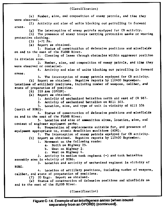 The intelligence annex, Figure C-14, disseminates information about forces essential to the conduct of the operation. It also gives any other necessary intelligence orders or guidance for the operation in question. In addition, it serves as a medium for instructing subordinate commanders to acquire information necessary for the conduct of the operation. Such information often can be obtained only immediately before or during the operation itself. The intelligence annex is not a substitute for an intelligence collection plan.