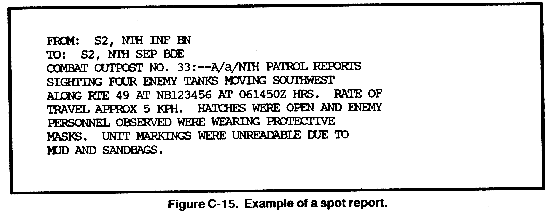 The spot report uses the SALUTE message format to report enemy size, activity, location, unit, time, and equipment. Figure C-15 shows a spot report.