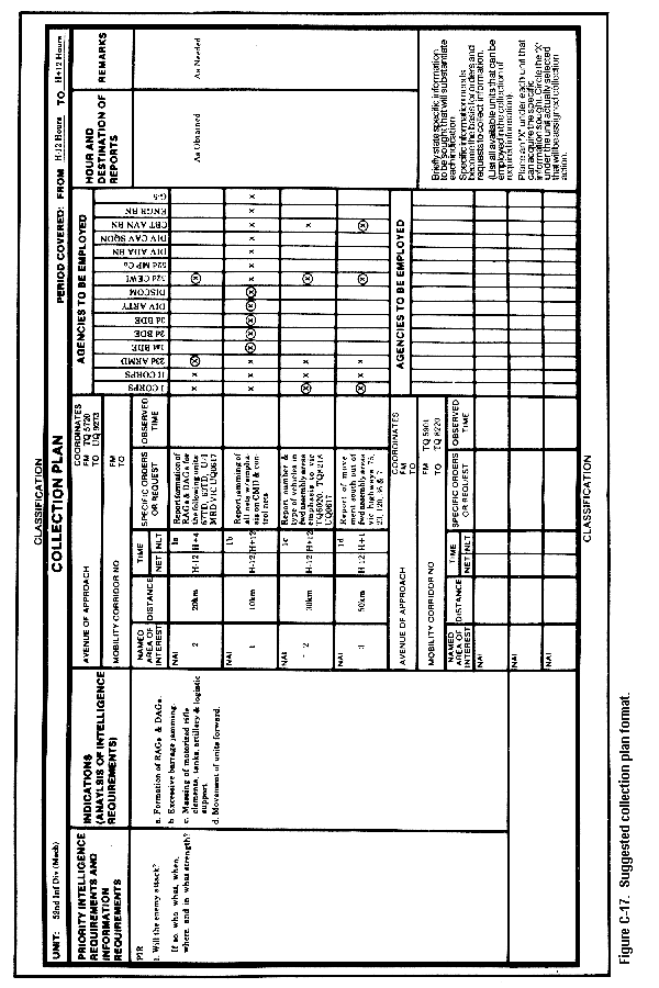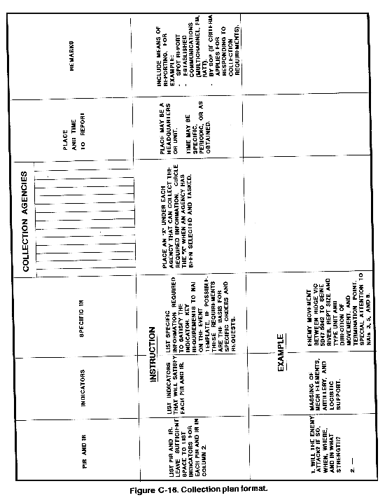Figure C-16 shows a collection plan format suitable for corps and division. Brigades and battalions can modify this format to fit their requirements. Figure C-17 is an example of a completed collection plan using fictitious data.