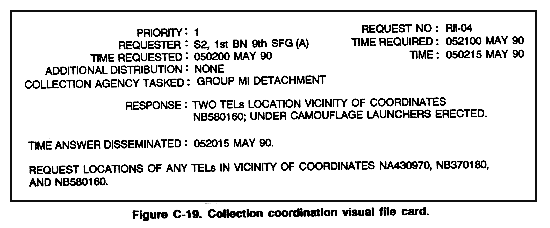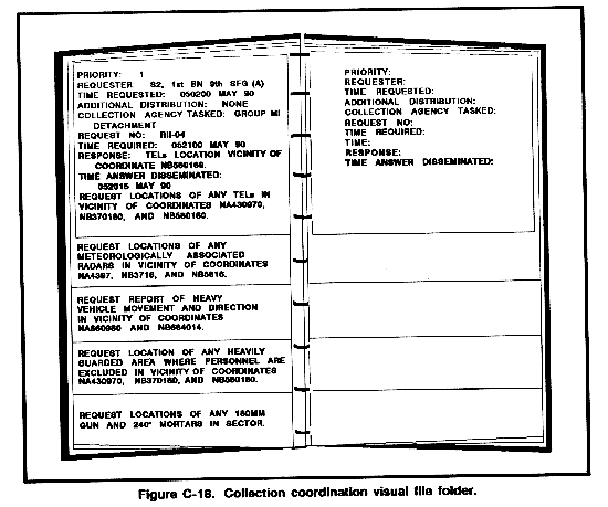 Another method for maintaining a collection plan is in the form of a visual file index using 5-by 8-inch cards (see Figures C-18 and C-19). In this method, a collection requirement is displayed across the bottom of a card. The remainder of the card may contain the following: