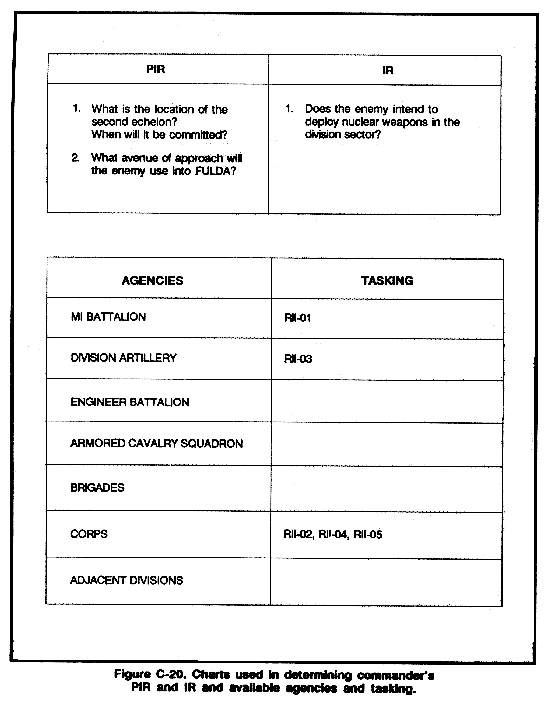 At corps and division, collection planning is more complex. The PIR of a corps commander often require in-depth analysis. The coordination of the overall collection effort is a major undertaking. For that reason, written collection worksheets prepared at these echelons are detailed.