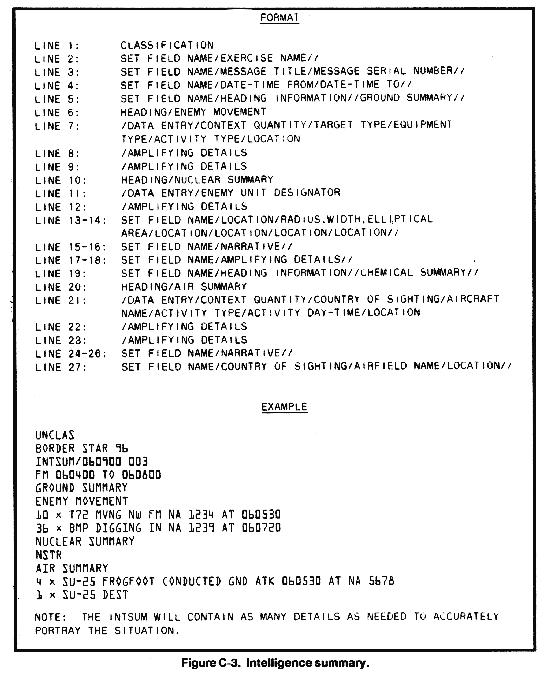 The intelligence summary (INTSUM), Figure C-3, provides a brief summary of information of intelligence interest covering a specific period of time. It provides a summary of the enemy situation in forward and rear areas, enemy operations and capabilities, and weather and terrain characteristics.