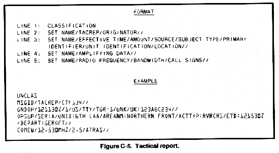 Use the tactical report (TACREP), Figure C-5, to quickly report vital intelligence information such as fleeting target, threat or danger to friendly units, distress situation, radio DF and other EW information, newly discovered enemy intentions, battle damage assessment (BDA) data, and combat information that cannot be exchanged with tactical data systems between tactical units.