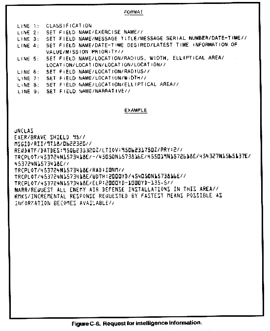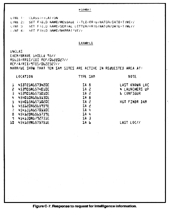 This appendix provides a brief description of the most common intelligence-related formats and examples prepared or used at the brigade and battalion levels. Several of the reports within this appendix have been written in the US Message Text Format (USMTF). For more information on these, refer to JCS Publication 25.