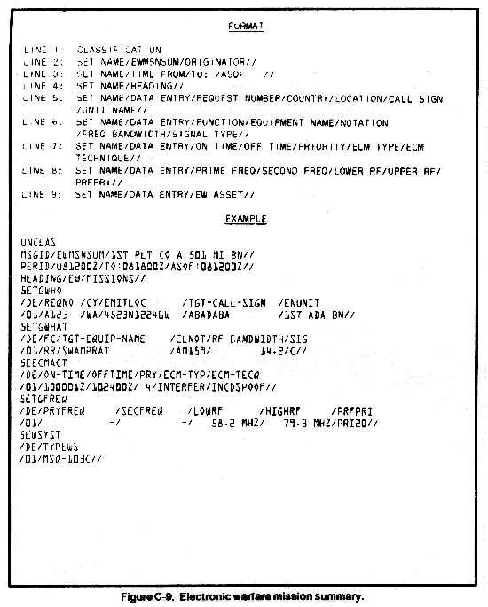 Use the electronic warfare mission summary (EWMSNSUM), Figure C-9, to summarize significant EW missions and the status of offensive EW assets. Use the TACREP for reporting results of ESM operations.