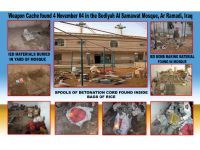 The first slide. This is one of the mosques that we uncovered while coming through Fallujah, one of the many that were stockpiled with caches of explosives, weapons and improvised explosive device- making material. You can see a suicide vest that is being modeled by one of the Iraqi warriors up here in the top left-hand corner, another suicide vest inside the mosque again down in the lower left-hand corner.