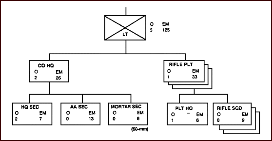 i. Rifle Companies. The rifle company is the main combat element within the battalion. It receives mission from the battalion commander. It is capable of conducting missions on its own or as part of the battalion. The rifle company is extremely light and footmobile. It consists of a headquarters platoon and three rifle platoons (Figure 1-9).