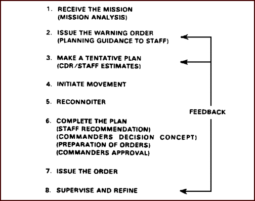 The LOGPAC vehicles have returned to the field trains after resupplying forward elements. The water and fuel collapsible storage drums have been filled by the FAST supply company. The mess team attached from the brigade mess section has drawn rations. The ammunition (ammo) squad that was originally positioned with the field trains has returned from the A TP with a quantity of ammo that has already been broken into loads for delivery forward. The unit maintenance team in direct support of the battalion from the brigade maintenance section is positioned with the field trains. A sequence of actions follows (some would occur simultaneously) :