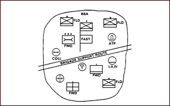 (6) Brigade Support Area. The BSA (Figure 1-18) is the logistical base for the brigade and contains FAST units as well as the trains (unit or field) of the light infantry battalion. These units provide sustainment operations for the brigade. They also provide storage for supplies and a holding capability for field services operations, when augmented.