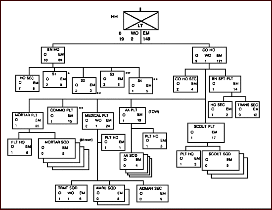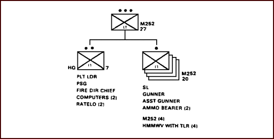 (2) Mortar Platoon. The battalion mortar platoon consists of four 81-mm mortars, M252, transported on HMMWVs. Their mission is to provide close and immediate fire support to the maneuver units. The mortar platoon organization is illustrated in Figure 1-5.