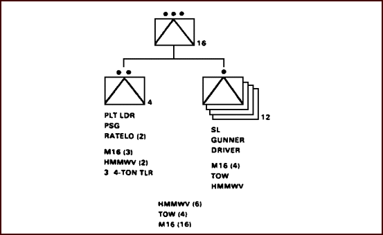 (5) Antiarmor Platoon. This platoon consists of four tube-launched, optically tracked, wire-guided (TOW) weapon systems mounted on HMMWVs with two additional HMMWVs used for command and control. The platoon operates as two sections with each section consisting of two TOW vehicles and a command and control vehicle. The antiarmor platoon organization is shown in Figure 1-6.