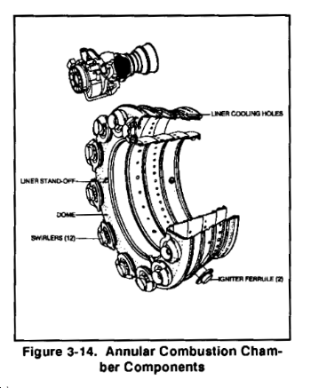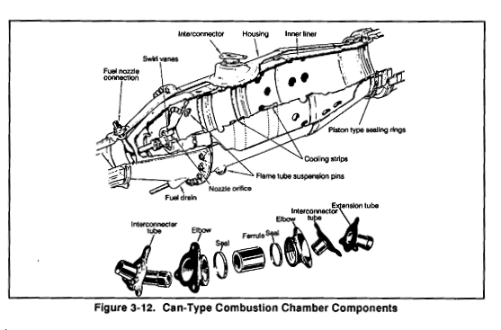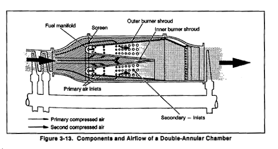 The air used for burning is known as primary air; that used for cording is secondary air. Secondary air is controlled and directed by holes and louvers in the combustion chamber liner. Igniter plugs function during starting only; they are shut off manually or automatically. Combustion is continuous and self-supporting. After engine shutdown or failure to start, a pressure-actuated valve automatically drains any remaining unburned fuel from the combustion chamber. The most common type used in Army gas turbine engines is the external annular reverse-flow type.