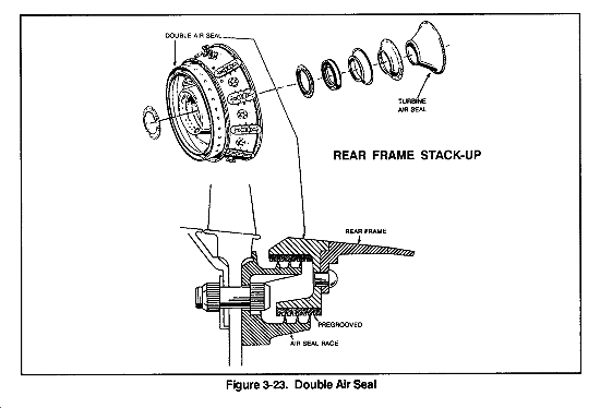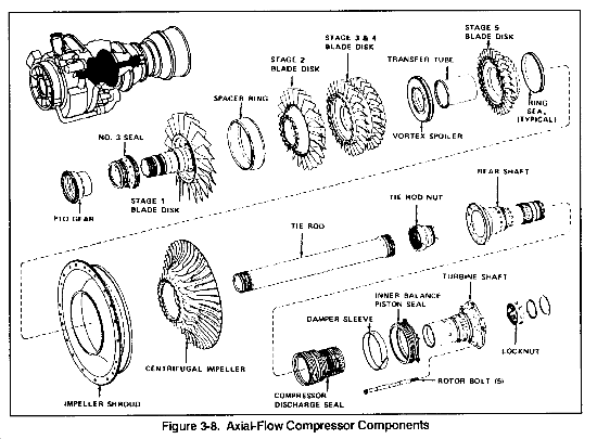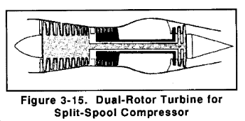 The dual compressor is a combination either of two axial compressors or of an axial and a centrifugal compressor (Figure 3-10). The dual-axial compressor consists of a low-pressure compressor in front and a high-pressure compressor in the rear. Both compressors (low and high) are driven by two different shafts that connect to different turbines. The starter is usually connected to the high-pressure compressor because it reduces the torque required to start the engine. With the rear (high-pressure) compressor turning at governed Speed, the front (low-pressure) compressor (not governed) is automatically rotated by its turbine. Rotation speed is whatever speed will ensure an optimum flow of air through the compressor. With the front and rear compressor rotors working in harmony instead of interfering with each other, compression rates can be increased without decreasing efficiency. Due to the added length of the engine this type of compressor is found on turbojet aircraft.