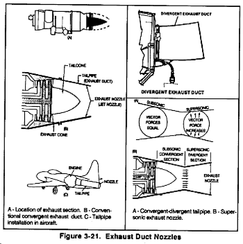 The front or inlet duct is almost entirely open to permit outside air to enter the front of the engine. The compressor works on the incoming air and delivers it to the combustion section with as much as twelve times or more the pressure the air had when it entered the engine. In the combustion section fuel is sprayed and mixed with the compressed air. The air-fuel mixture is then ignited by igniter or spark plugs. Once the mixture is lighted the igniter is turned off as the burning process will continue without further assistance, providing the engine is supplied with the right air-fuel mixture. This air-fuel mixture bums at a relatively constant pressure with only about 25 percent of the air taking part in the actual combustion process The rest of the air is used for cooling some of the components of the combustion section, This heated expanding air is then directed to the turbine. The turbines are connected to the compressor and accessories. They will extract a major portion (nearly two-thirds) of the energy to drive them. The remaining energy will be used to either propel the aircraft through a jet nozzle or to turn other times (power turbines). Power turbines will take this energy and transform it into shaft horsepower, which in turn drives an output shaft or propeller from a power shaft.