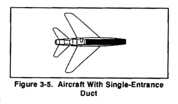 There are two basic types of air entrances in use: single entrance and divided entrance. Generally, it is best to use a single entrance with an axial-flow engine to obtain maximum ram pressure through straight flow. Single entrance is used almost exclusively on wing or external installations where the unobstructed entrance lends itself readily to a single short, straight duct (Figure 3-5).