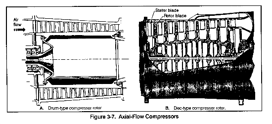 Axial-flow compressors have two main elements: a rotor (drum or disc type) and a stator. These compressors are constructed of several different materials depending on the load and operating temperature. The drum-type rotor consists of rings that are flanged to fit one against the other so that the entire assembly can be held together by through bolts. This type of construction is satisfactory for low-speed compressors where centrifugal stresses are low (Figure-3-7). The rotor (disc-type) assembly consists of--