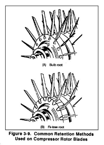 Rotor blades are generally machined from stainless steel forgings, although some may be made of titanium in the forward (colder) section of the compressor (Figure 3-8). The blades are attached in the disc rim by different methods using either the fir-tree-type, dovetail-type, or bulb-type root designs. The blades are then locked into place with screws, peening, locking wires, pins, keys, or plates (Figure 3-9). The blades do not have to fit too tightly in the disc because centrifugal force during engine operation causes them to seat. Allowing the blades some movement reduces the vibrational stresses produced by high-velocity airstreams between the blades. The newest advance in technology is a one-piece design machined blade disc (combined disc and blade); both disc and rotor blade are forged and then machined into one (refer to Figure 3-8 again).