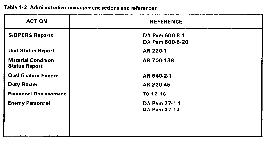 At the unit level, personnel and administrative tasks are handled by the first sergeant or unit clerk. The battalion S1 supervises the PAC which provides support to the units. The PAC does as many administrative tasks as possible to reduce the work load at the unit level. As unit commander, you are responsible for developing administrative management procedures. Use FM 12-3-1 and Army regulations in the 340 series for guidance. Other administrative management actions and references are listed in Table 1-2.