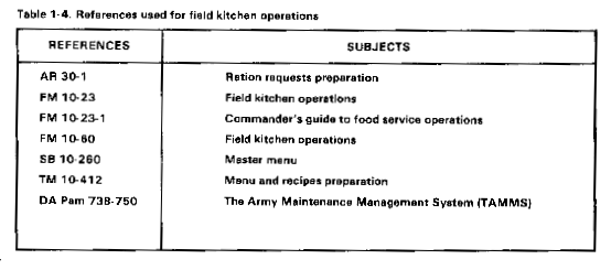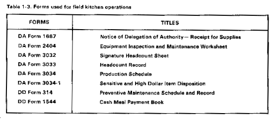 Your food service sergeant is responsible for field kitchen operations. Table 1-3 lists forms that are used in peacetime or in field training exercises. Table 1-4 lists some useful references.