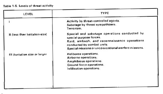 As unit commander, you are responsible for the security and defense of your personnel and equipment. Combat units will probably be located between your unit and the enemy. However, this does not mean that there is no chance that your unit will be attacked by threat forces. There is always a major element of threat to rear operations. This threat includes cells and networks of agents; special-purpose forces; reconnaissance units; and rocket, missile, and air strikes. Also, it may include airborne and heliborne units; radio electronic combat operations; and nuclear, biological, or chemical warfare. More information on threat tactics and equipment can be found in FMs 100-2-1, 100-2-2, and 100-2-3. The three levels of threat activity are shown in Table 1-5.