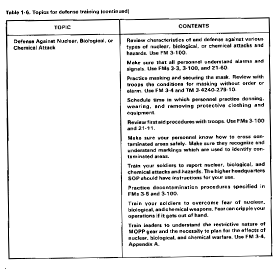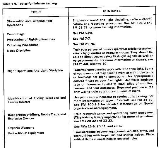 Defense training, including on-the-job training, should be given a high priority. Make sure your personnel are familiar with the unit defense plan and are trained in the specific duties assigned to them as part of the plan. Table 1-6 contains suggested defense topics and helpful information that you should consider in developing your defense training programs.