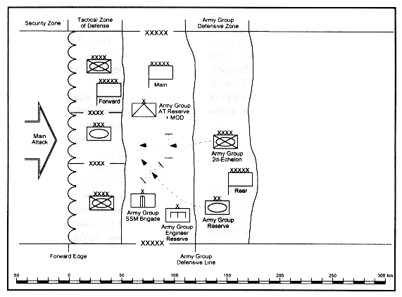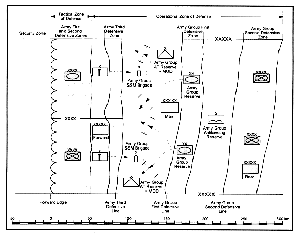 The total depth of this defense, with three army zones and two army group zones, may reach up to 250 to 300 km from the forward edge.