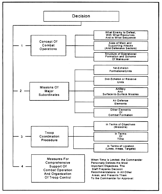 The commander is responsible for the combat capability of subordinate units, the organization of combat operations, the maintenance of uninterrupted C2, and the successful conduct of combat missions. He clarifies the mission he receives (that is, he determines his forces' place in the senior commander's concept of operations). He may do this alone or jointly with the chief of staff. He then gives instructions to the chief of staff on preparing his forces and staff for combat. He also provides instructions about the timing of preparations. The commander makes his own assessment of intelligence data supplied by the chief of reconnaissance, who heads the intelligence directorate. Then, with advice from the chiefs of branches, he makes an assessment of his own forces. After discussing his deductions and proposals with the chief of staff, the commander reaches a decision, issues combat missions to subordinates, and gives instructions about planning the operation. He then organizes coordination within his organization and with adjacent forces and other elements operating in his area of responsibility.