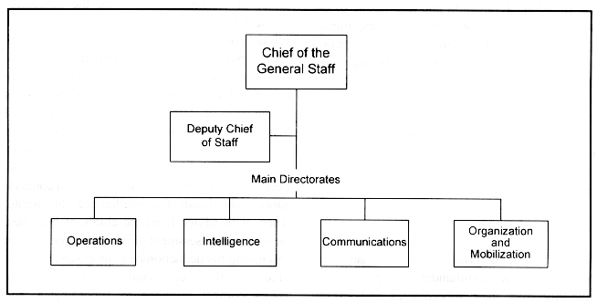 The General Staff consists of four staff directorates. These are the main directorates for operations; intelligence; communications; and organization and mobilization. (See Figure 7-2.) Working with the staffs of each of the services, the Main Operations Directorate drafts detailed plans for strategic operations for the Supreme High Command. Once the Headquarters of the Supreme High Command approves the plans, the General Staff issues them to operational commanders as Supreme High Command directives. Because of the uncertainties of combat, the General Staff continually reevaluates and refines these directives. Its Main Organization and Mobilization Directorate determines the assets the force needs to perform strategic operations.