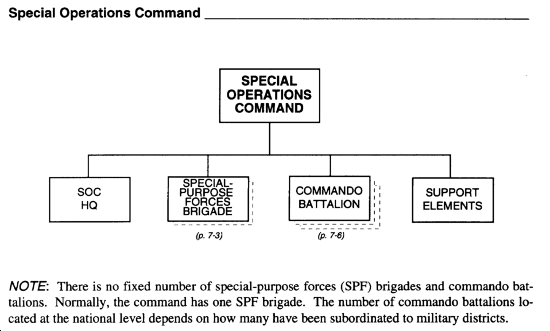 The OPFOR National Headquarters actually comprises three headquarters in one. It includes the Supreme High Command Headquarters and its executive agency, the General Staff. Since the Ground Forces are by far the largest branch of the armed forces, the National Headquarters also doubles as the Ground Forces Headquarters. Of the four branches, only the Ground Forces and the Air Force are large enough to warrant separate chapters. (Chapters 1 through 5 cover the Ground Forces, and Chapter 8 the Air Force.) This chapter provides some detail on the other two branches: the Special Operations Command and the Navy. It also covers the General Staffs Directorate of Military Intelligence and the Internal Security Forces of the Ministry of the Interior, which come under control of the General Staff in wartime.