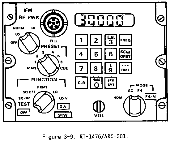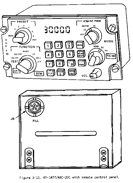 (b) The RT-1477/ARC-201 provides a remote capability for installations where the radio must be located away from the pilot's cockpit. It has a separate radio and remote control panel (Figure 3-10) so the pilot can remotely control the radio from his position in the aircraft. The RT-1476/1477 has retransmission capabilities.