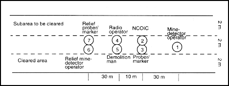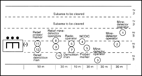 Soldiers 1, 2, and 3 (mine-detector operators) lead the sweep team in echelon. Each sweep team covers 2 meters of front, and sweep teams are spaced 30 meters apart to prevent fatalities from accidental detonation by other mine-detector operators. If required, a fourth mine-detector operator can be added to the detection column.