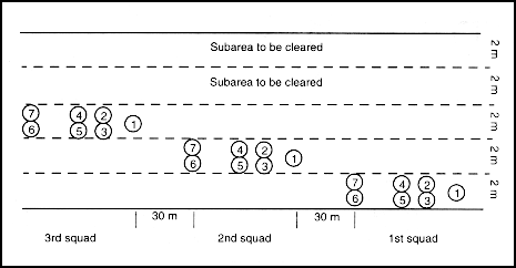 Soldiers 6 (radio operator) and 7 (demolition man) follow 10 meters behind Soldiers 4 and 5 and are centered in the cleared lane.
