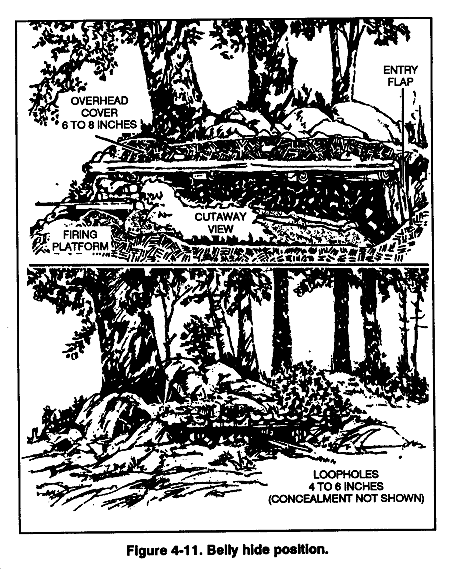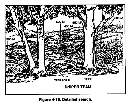 (3) Stay low to observe. A low silhouette makes it difficult for the enemy to see a sniper team. Therefore, the team observes from a crouch, a squat, or a prone position.