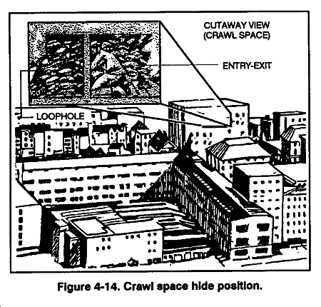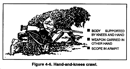 d. Hand-and-knees Crawl. The hand-and-knees crawl (Figure 4-6) is used when some concealment is available and the sniper team needs to move faster than the medium crawl.