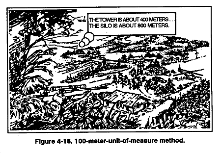 b. 100-Meter-Unit-of-Measure Method. To use this method (Figure 4-18), the sniper team must be able to visualize a distance of 100 meters on the ground. For ranges up to 500 meters, the team determines the number of 100-meter increments between the two objects it wishes to measure. Beyond 500 meters, it must select a point halfway to the object and determine the number of 100-meter increments to the halfway point, then double it to find the range to the object.