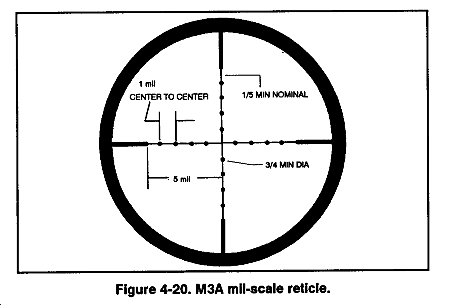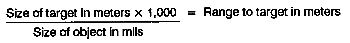 f. Mil-Relation Formula. The mil-relation formula is the preferred method of range estimation. This method uses a mil-scale reticle located in the M19 binoculars (Figure 4-19) or in the M3A sniperscope (Figure 4-20). The team must know the target size in inches or meters. Once the target size is known, the team then compares the target size to the mil-scale reticle and uses the following formula: