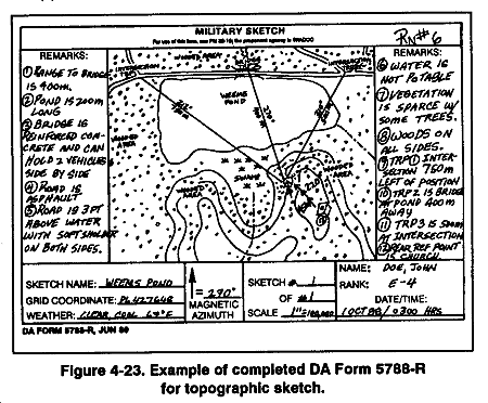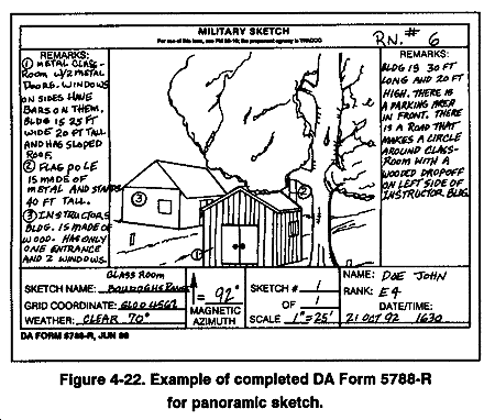 DA Form 5788-R (Military Sketch) is used to record information about a general area, terrain features, or man-made structures that are not shown on a map. Military sketches provide intelligence sections a detailed, on-the-ground view of an area or object that is otherwise unobtainable. These sketches not only let the viewer see the area in different perspectives but also provide detail such as type of fences, number of telephone wires, present depth of streams, and so forth. There are two types of military sketches as stated in FM 21-26 panoramic sketches and topographic sketches. Information is recorded on DA Form 5788-R. (A blank copy of this form is located in the back of this publication for local reproduction.)