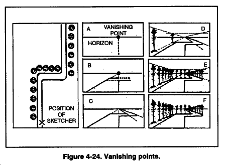 (3) Draw in perspective; use vanishing points. Try to draw sketches in perspective. To do this, recognize the vanishing points of the area to be sketched. Parallel lines on the ground that are horizontal vanish at a point on the horizon (Figure 4-24). Parallel lines on the ground that slope downward away from the observer vanish at a point below the horizon. Parallel lines on the ground that slope upward, away from the observer vanish at a point above the horizon. Parallel lines that recede to the right vanish on the right and those that recede to the left vanish on the left (Figure 4-24).