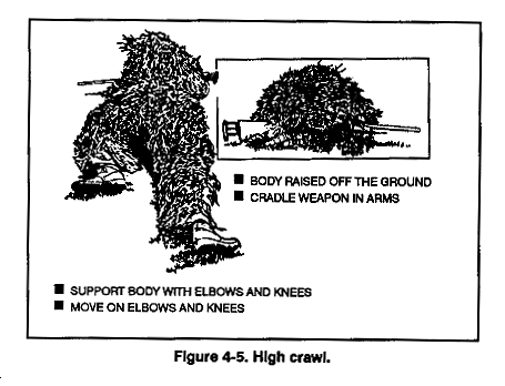 c. High Crawl. The high crawl (Figure 4-5) is used when concealment is limited but high enough to allow the sniper to raise his body off the ground. The high crawl is similar to the infantry high crawl.
