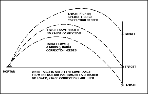 c. Determination of Vertical Interval for Different Missions. When there is a difference in altitude between the mortar position and the target, a range correction is made. Since the mortar round has a steep angle of fall, corrections are made only when differences of 50 meters or more in altitude exist. The chart range is corrected by one-half the difference in altitude expressed in meters. The correction is added when the target is above the mortar, and subtracted when the target is below the mortar. Difference in altitude can be determined from contour maps, by estimating, or by measuring the angle of sight, and by using the mil-relation formula.