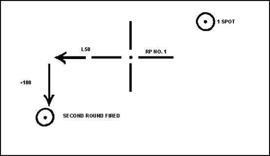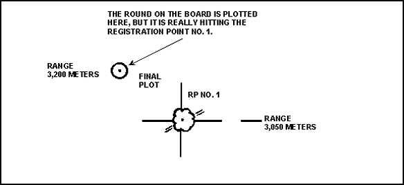 (6) The spottings for additional rounds are spotted from the initial RP, but the corrections (spotting reversed) are applied to the last fired plot. This procedure is repeated for all adjustment rounds until a range correction of 50 meters is split.