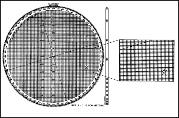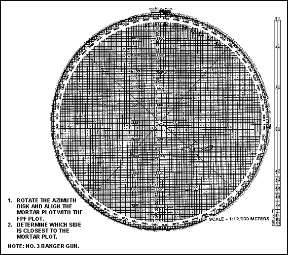 (2) After drawing the FPF line, the computer rotates the azimuth disk and aligns the mortar plot with the FPF plot to see which side of the line is closest to the friendly troops (Figure 14-16).