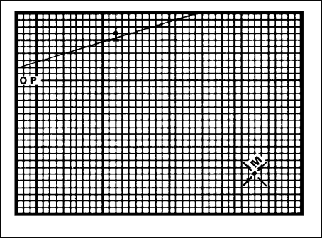 (c) Once the average azimuth for each FO has been determined, index the average azimuth and draw a line from each FO position toward the top of the board; where the lines intersect is the MPI. Determine and record the eight-digit grid coordinates and altitude of the MPI.