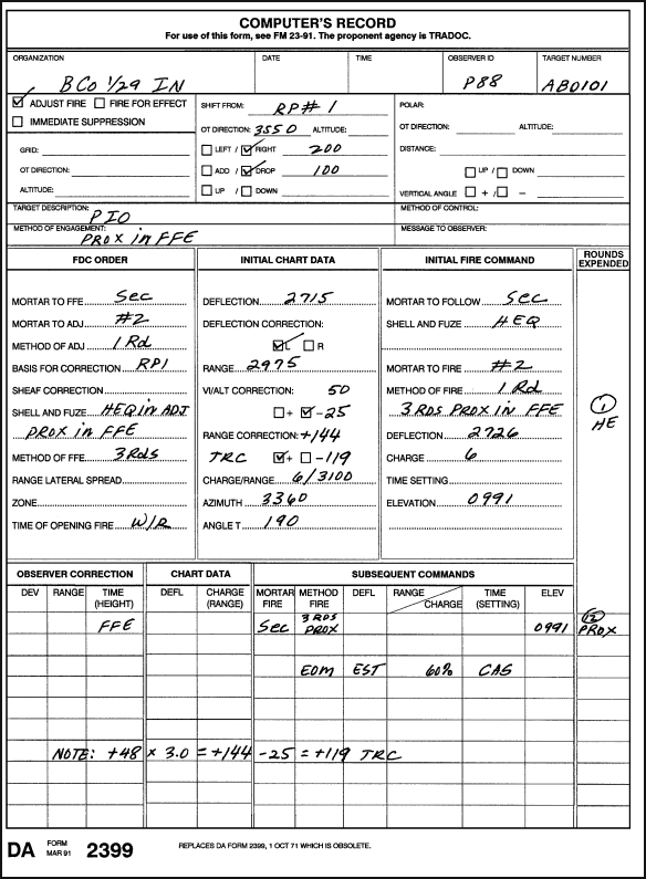 Figure 14-14. Example of completed DA Form 2399 for computing FPF missions.