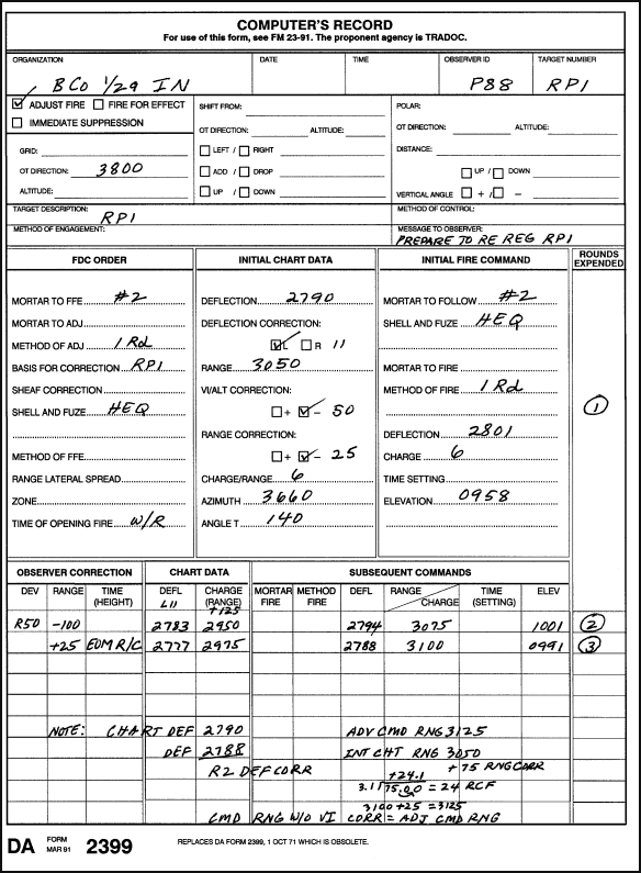 Figure 14-6. Example of completed DA Form 2399 for firing a total range correction mission on the surveyed chart.