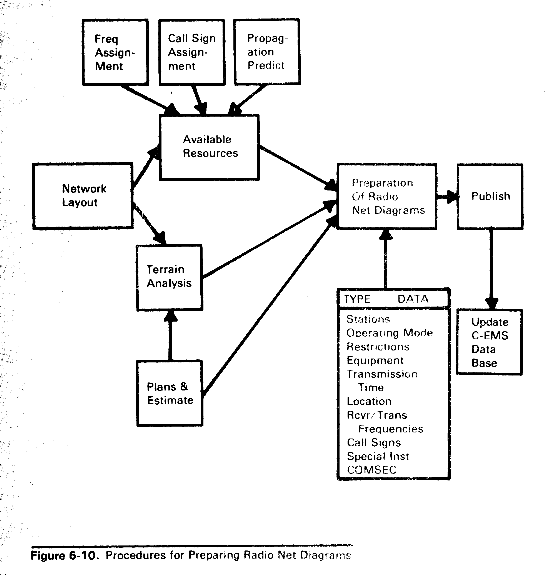 (1) Preparation (fig 6-10). The C-E staff of each major command prepares the radio net diagrams which are normally command oriented and supplement the multichannel systems. The senior signal unit and each organic subordinate unit prepare radio net diagrams which are forwarded to the command C-E section.