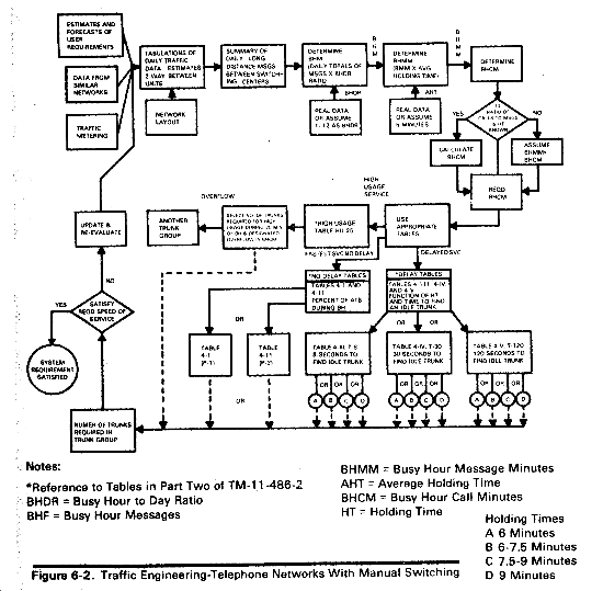 a. Manual and Dial Central Offices. The important aspects of traffic engineering for manual and dial central offices are trunk group planning (fig 6-2) and determining operator position requirements. The procedures for obtaining and using traffic data for engineering networks with manual switching controls are covered in TM 11-486-2. Although TM 11-486-2 establishes traffic engineering standards for fixed communications networks, the standards may also be used as guides for tactical systems.